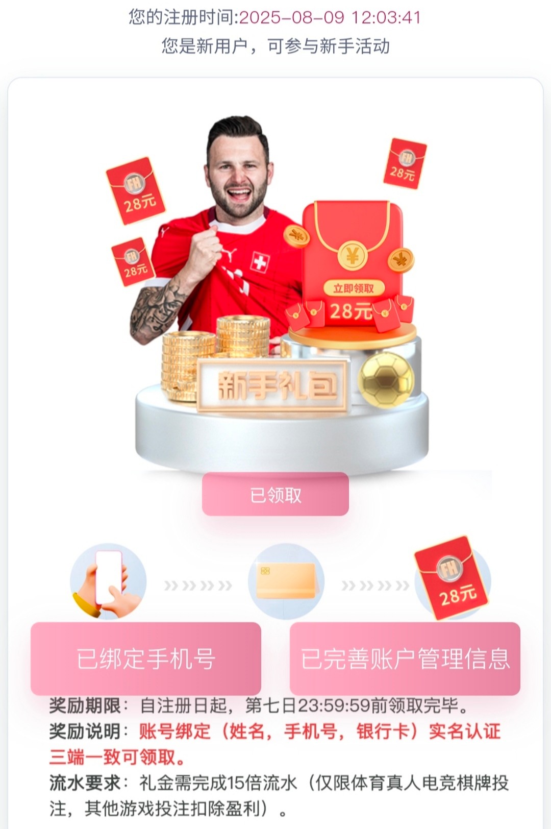 我号4年了又重新注册一个,开的VPN,绑的新的手机号银行卡,提的支付宝,有兴趣可以试试重新搞一下,活动里去申请28彩金,15倍出款100,据说随机黑,介意别去。