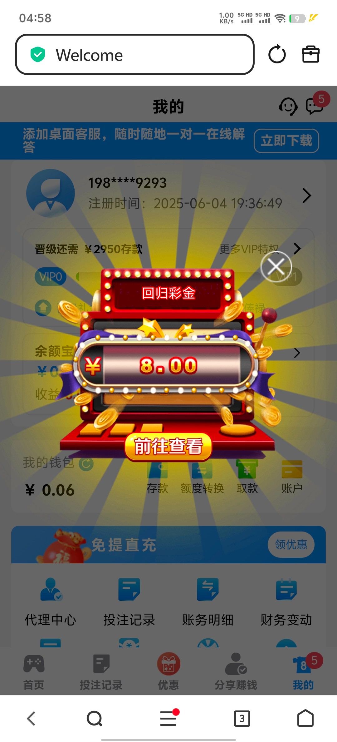 新葡京3333回归彩金,之前充过50,看小篮板最近有回馈,登上就有。之前很多人注册过的,有号的上去看弹窗