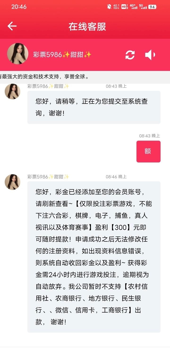 地址5986.cc 下载注册绑卡找客服申请下载彩金 发账号和登录点我的截图 客服回复很慢 我领到了没打出来 不会玩 只能彩票