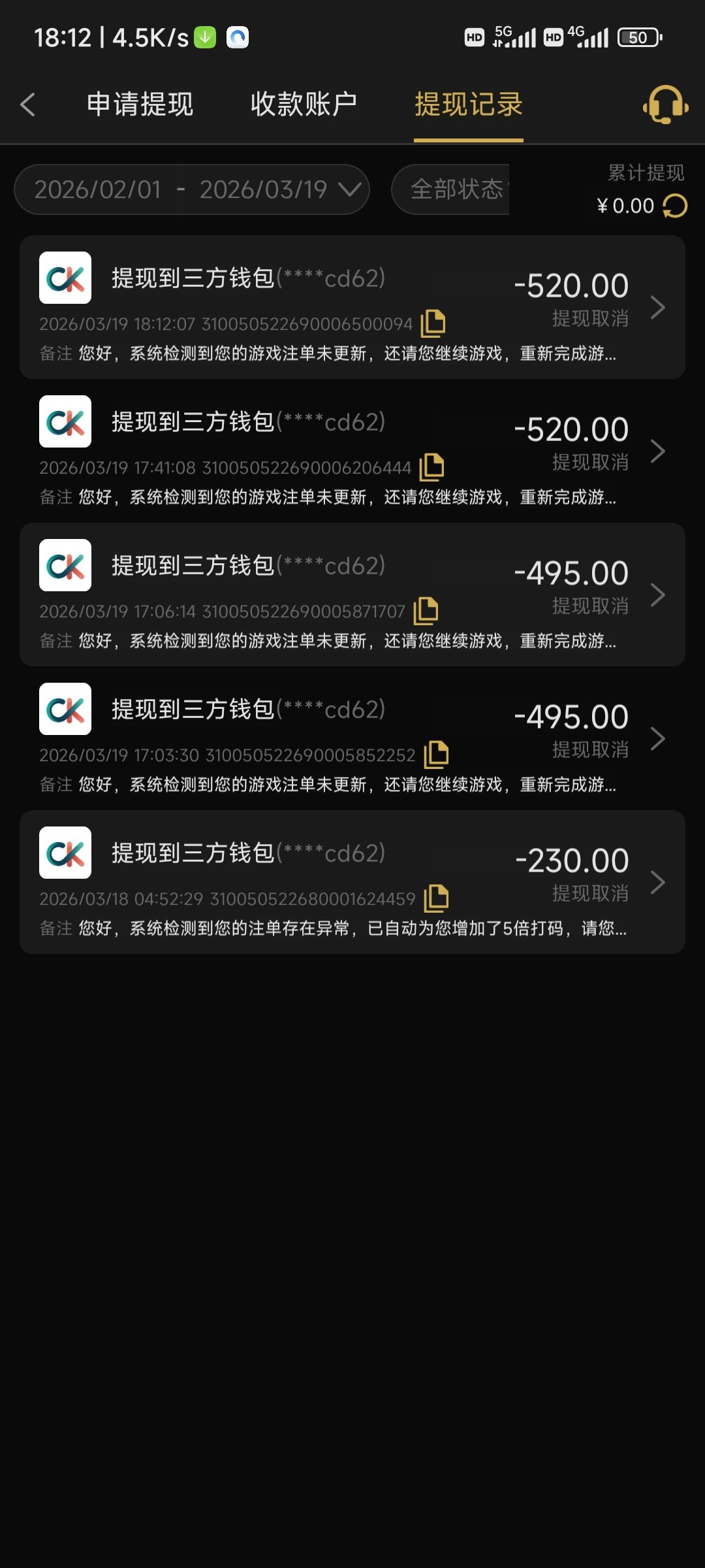 充值300提500打了3000流水,提现都是直接秒取消,只进不出黑台注意。