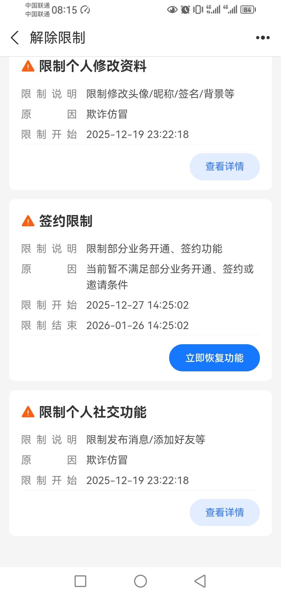 名下三个支付宝全部限制社交功能,请问这个是限制多久,怎么能解开,能提供解决方案的打赏500金币,金币就这么多多了,